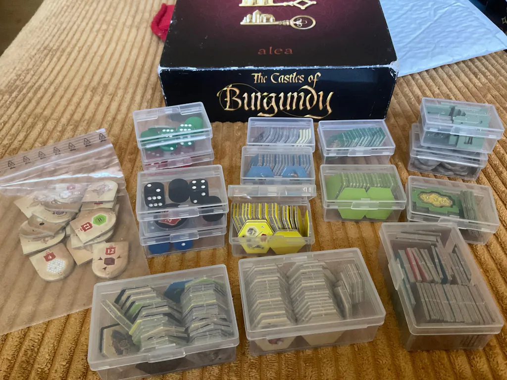 I was super stoked to have these containers not just to get rid of plastic bags but because I thought I would be able to avoid having to dump the pieces out into bowls so they could be easily accessible for refilling after each phase. But you really have to cram the pieces in exactly perfectly in order to close the lids so it actually makes you take more time to put them away than the bags. And you still have to dump them out because they're packed so tightly you can't easily just randomly take pieces out to restock the board. And some of the containers barely close bc they are so crammed full. The mini containers work fine for coins and dice and men. But all the tiles really need an "original" sized container and the buildings and black tiles need something even larger in order to be really helpful. A better configuration would be six minis, six originals, and two extra large. Plus another extra large for shields.